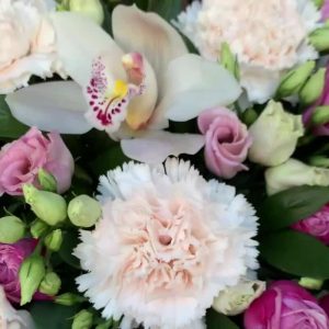 Авторский букет: орхидея розовая, диантус персиковый и роза розовая Маритим